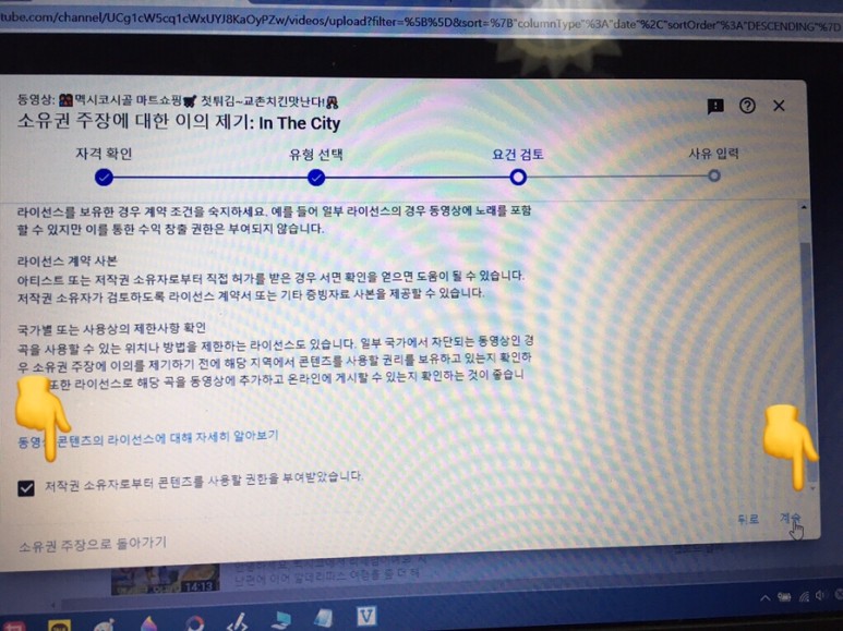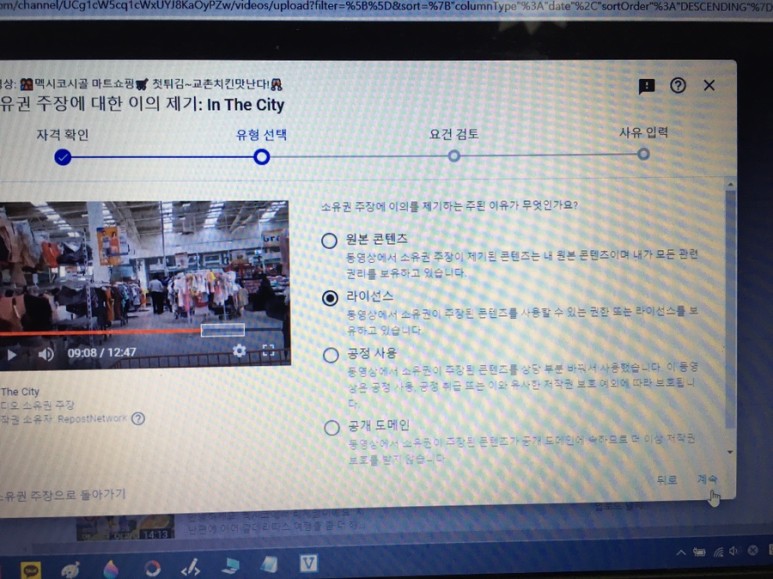 👆 이의제기의 두 번째 화면입니다.두 번째 항목 '라이선스' 선택!! (동영상상에서 소유권이 주장된 콘텐츠를 사용할 수 있는 권한 또는 라이선스를 보유하고 있습니다.)
