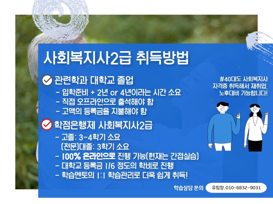 안녕하세요! 40대 사회복지사 2급 자격증을 취득할 수 있도록 도와드리는 학습멘토 유 팀장입니다.
