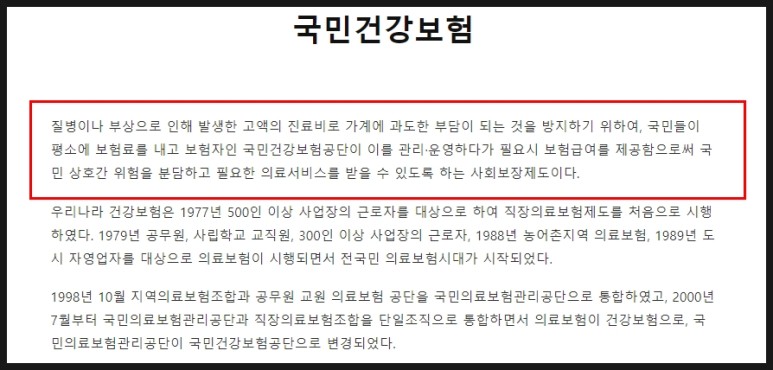 ●국가의 4대 보험보장제도 중 하나 저희 4대 보험제도 중 하나입니다. 부상이나 질병에 걸렸을 경우, 보통 고액의 진료비로 가계에 부담이 됩니다. 국민들이 평소 보험료를 내고 그에 따라 보험자인 국민건강보험공단이 관리하고 있습니다.