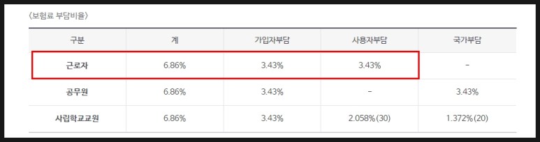 회사원 가입자는, 근로자, 공무원, 사립학교 교원에 의해서 다른 비율로 지불합니다. ①근로자는 총 6.86%인데, 가입자 부담액이 3.43%이며, 사용자(기업) 3.43%, ②공무원은 총 6.86% 중 가입자 3.43% 국가 3.43% ③사립학교 교원은 총 6.86% 중 가입자 부담액이 3.43%, 사용자 부담 2.058%, 국가 1.372%, 사립학교 교원은 총 가입자 부담액이 3.43%이며, 사용자 부담액이 2.472%, 국가 1.372%,
