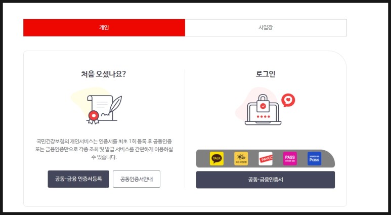 이후에는 개인이나 사업장에 들러 로그인해 주시기 바랍니다. 개인의 경우 카카오, KB금융은행, 페이코, 패스앱으로 인증 가능합니다.