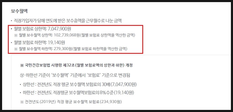 ① 월별 보험료 상한액은 7,047,900원이며, 월급 기준으로 102,739,068원입니다.② 반대로 하한액은 19,140원이고, 월급 기준으로 279,300원입니다.