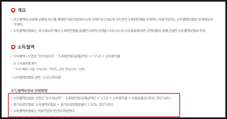 소득 월 보험료의 경우 {(연간 보수 외 소득 -3,400만원(공제액)*112} * 소득 평가율 * 보험료율 입니다.