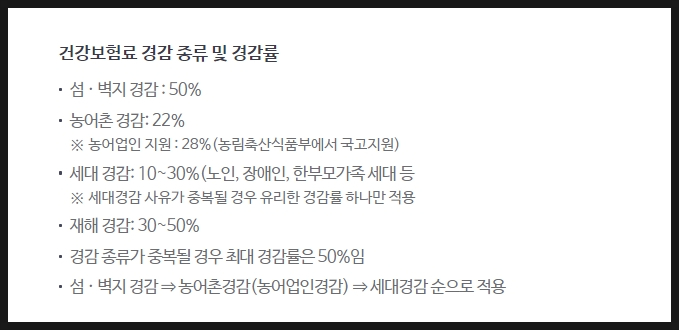 ①국외근무자의 경우 국내 피부양자가 있는 경우 50% 경감 ②섬, 벽지근무자의 경우 50% 경감 ③군인의 경우 20% 경감 ④휴직자는 50% 경감 (육아휴직자는 보수월액 보험료의 하한까지) ⑤임의계속 가입자도 50% 경감 종류가 중복되면 최대 경감율은 50%, 예를 들어 섬에서 일하는 군인이면 50% 감면소득월액에 따른 건강보험료 산정기준