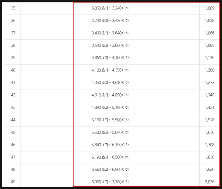 소득점수는 위 점수에 따라 부과 됩니다. ①년 소득이 3,050만원을 넘고 3,240만원 이하면 1,009점 적용 ①3,240만원 초과 3,430만원 이하면 1,038점 ②3,430만원 초과 3,640만원 이하면 1,066점 등 다양한 점수가 적용됩니다.