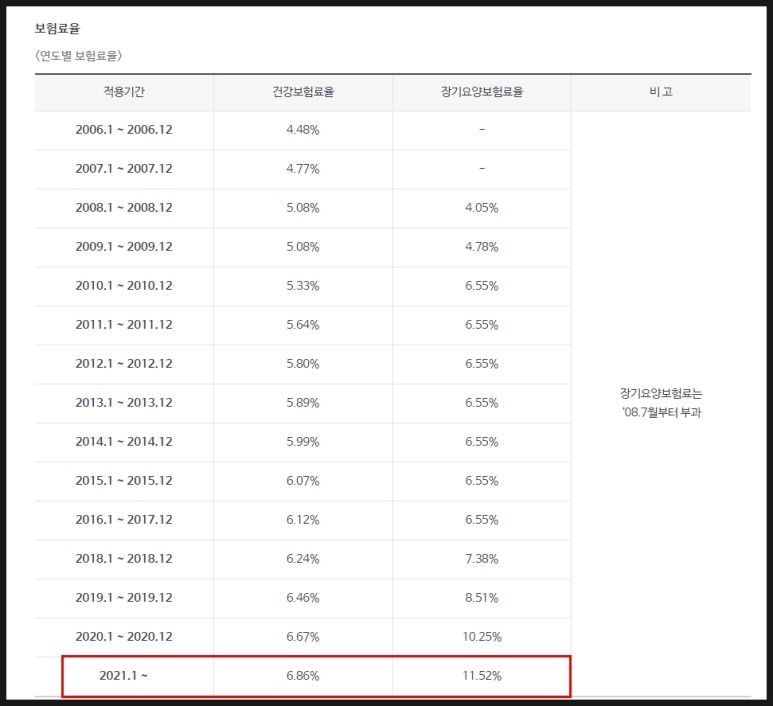 2006년도 1월에는 4.48%에서 시작해서 2020년도에는 6.67%까지 올라가고 2021년도에는 6.86%입니다장기 요양 보험료율의 경우에는 2007년까지는 없지만 2008년부터 부과해 2021년에는 11.52%입니다. 내년에도 더 오를 전망입니다.