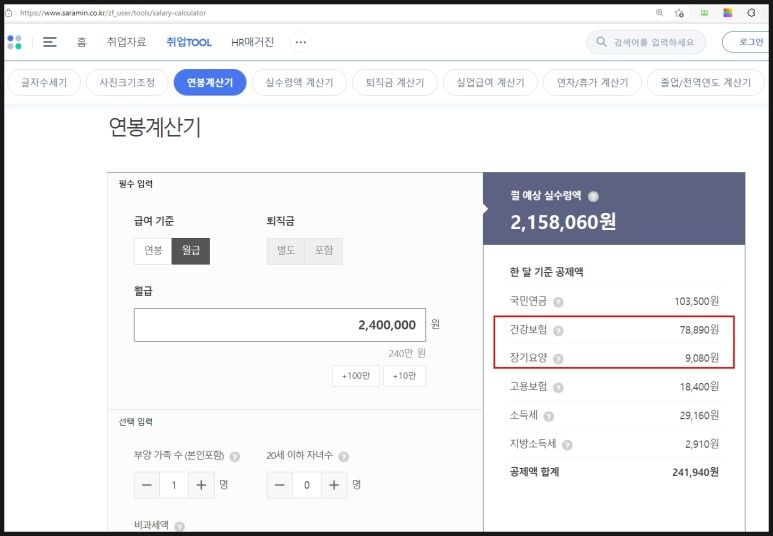 사람의 연봉계산기에 자신의 연봉, 월급만 입력하면 간단하게 장기요양보험료, 건강보험료를 조회할 수 있어요. ●별도로 경감은?