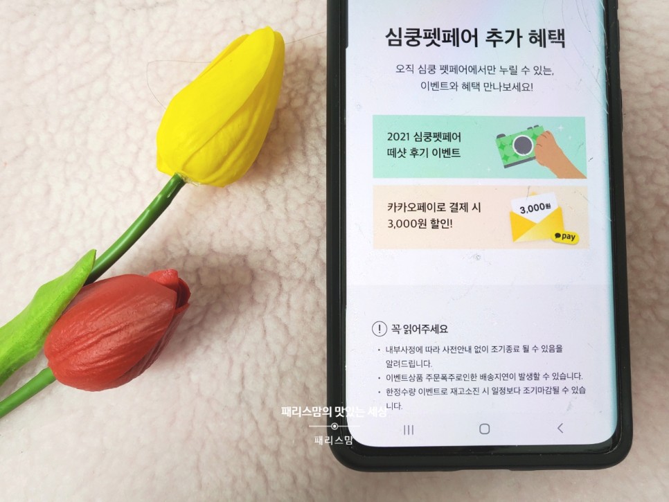 정말 빠른 배송도 박수 치고 싶은데 주문을 저녁에 했는데 다음 날 새벽에 배송으로 오거든요 휴일인데 오겠니? 그런 생각을 해 본 적이 없어졌는데 다음날 새벽에 배송이 와서 너무 놀랐어요 웰시코기 패리스를 반려 중인 패리스 엄마가 이번에 2021 심쿵펫페어에서 구입한 파격가 샷입니다아직 몇일 남아서 다시 장바구니에 넣어두었는데 일단 필요한 애견용품을 구입하고 나면 더 사야겠다고 아쉬워하는데 20일까지 하다니 지금도 늦지 않았습니다.특히 올해 마지막 펫페어라고 하니 잊지말고 펫프렌즈 앱에 가입하시면 신규회원은 5천원 추가할인도 가능하오니 더욱더 알뜰하게 쇼핑하실 수 있습니다. 올해 마지막 펫프렌즈 심쿵펫페어가 네 번째래요 1년에 2회 열립니다만, 4회는 10월 11일부터 10월 20일까지군요.코로나에 의해 작년에는 모든 대면 펫 페어는 거의 취소되면서 언택으로 즐기는 시대가 이곳저곳인데, 오가는 것도 문제지만 주차장은 항상 너무 힘들고 짜증스러운데, 많은 애견용품을 온라인에서 비교하며 할인받고 구입도 가능하기 때문에 심쿵 펫 페어가 인기가 있다고 합니다.저도 돌봄육아를 하다보면 예전처럼 오프라인으로 가기가 쉽지 않아서 이번에 처음 이용하는 건데 정말 만족스러워요. 2021 펫프렌즈 펫페어의 특징은 심쿵특전이죠?베스트상품 최대 86% 할인... 이건 손이 눈보다 더 빨라야 하거든요" 하지만 실망은 금물 1+1 상품이 많거든요.게다가 사은품 증정까지 하다니 이게 이득이에요.매일 오후 6시에 100원 딜이 열립니다. 이거야말로 손이 빨라야하지 않겠어요?깜짝 이벤트도 있었어요 테이프 커트로 사진을 찍어서 본인 인스타그램에 인증하고 참가 신청을 하면 3,000원 100% 준대요저도 패리스랑 같이 샷사진도 찍어봤는데 테이프 컷팅 행사 기간은 10월 31일까지고 포인트는 11월 3일이래요그림을 클릭하면 해당 이벤트나 구매 창에 가면 편하겠네요. 화면을 보시면 only 펫 페어 구성이라고 보여요할인도 특별히 큰 편이지만 새벽에 배송이라고 되어 있으면 다음날 바로 배송이 되거든요.특히 갑자기 사료가 떨어지거나 배변패드 등이 떨어지면 저는 가까이서 구하기 힘든 지역이라 고민하는데 새벽배송이라 너무 좋았습니다.사료, 간식, 용품 등 여러 가지 카테고리가 있어서 필요한 제품의 카테고리를 보고 선택하면 됩니다 푸드도 퍼피, 성인, 시니어, 전 연령, 에어 동결 식품, 건식 푸드, 소프트 푸드 등 다양하게 갖추어져 있군요.미끼로 1+1도 되게 많았어요 구입하려고 생각한 후드가 있으면 비교해 보고 1+1을 이용해도 괜찮은 거죠? 추가 증정이 있어서 사료나 용품을 구입하면 추가로 증정도 해드리거든요. 전에 펫 페어라는 것이 이번에 펫 페어에 출품된 상품이라는 것을 기억하십시오.