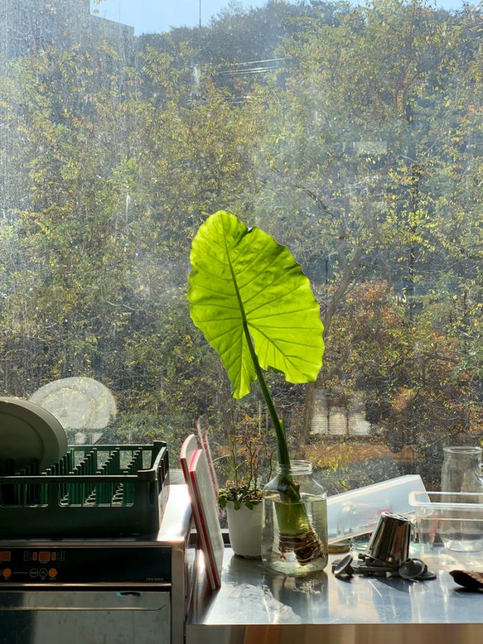 카페의 식물 인테리어와 빼놓을 수 없는 알로카시아도 보였어요 ~ ! 실내 조경식물 중 아예 큰 사이즈를 골라 기르시는 분들도 계시지만 워낙 성장속도가 빠르기 때문에 소품부터 도전해 봐도 좋을 것 같습니다.
