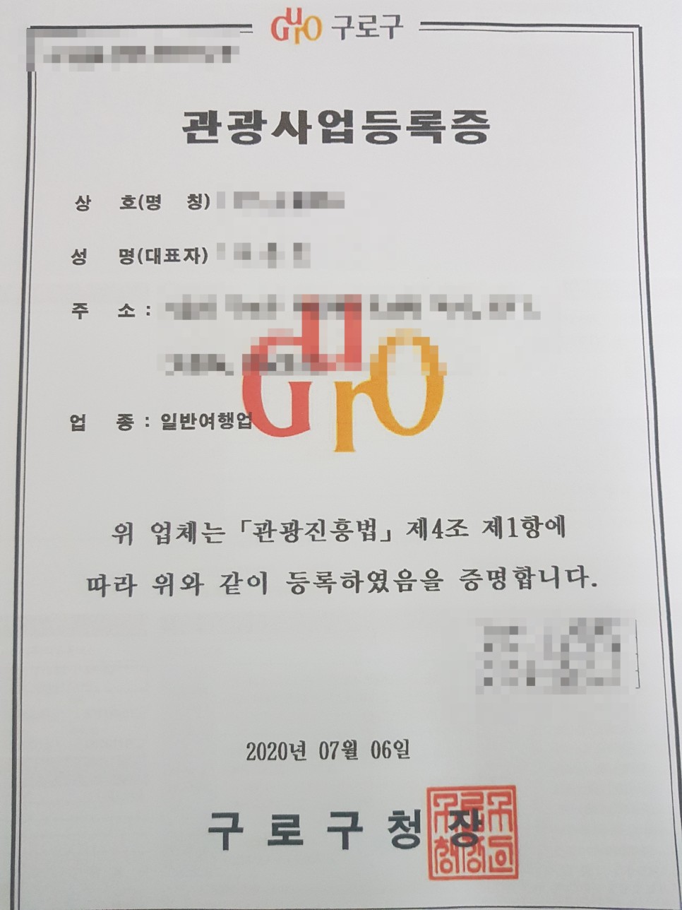 오늘은 이번 주 발행 완료된 여행사에 대한 리뷰입니다지난 주 구로구청에서 관광사업자 등록을 위한 접수 및 진행을 시작했습니다.이전에 다른 업종의 업무를 보던 회사이다 보니 몇 가지 작업이 필요했고, 하나씩 진행하여 최종 등록증 발급 및 보증보험 가입까지 완료하게 되었습니다. 그럼으로써 기존의 다른 업을 행하고 추가로 여행업을 진행하고 싶을 때 도움이 되는 내용을 정리해 봅시다.^^