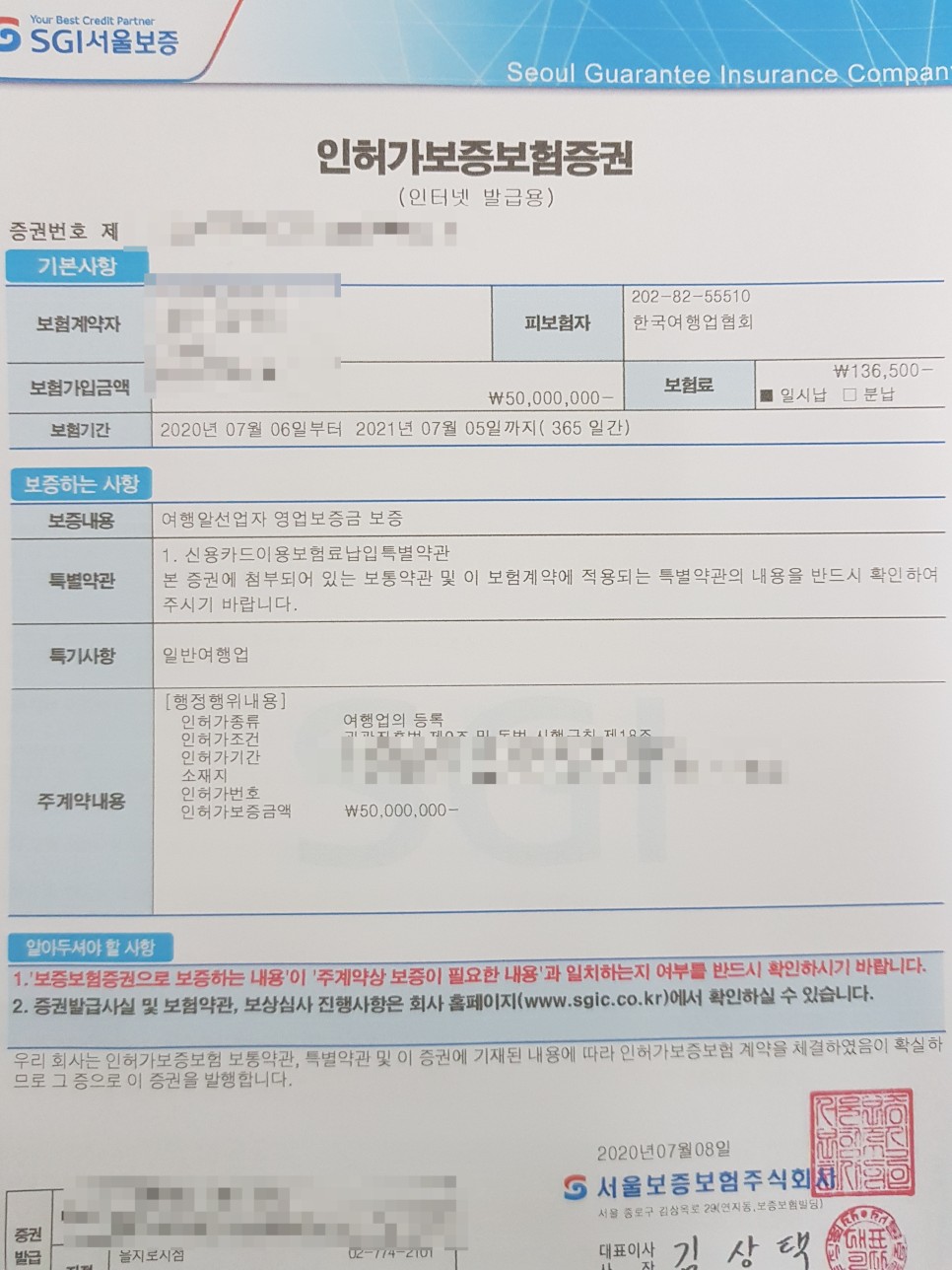3. 관광사업자 등록 후 등록면허, 허가세 납부관광사업자 등록증의 경우 면허세가 조금 높은 편입니다. 67,500원입니다.이것은매년발생해서최초등록시에납부하셔야합니다.따라서12월에등록할때납부하시고,다음해1월에해당년도의등록세를납부하게되는데요.또한 간혹 사업을 하지 않더라도 등록증이 폐업되지 않으면 매년 납부고지를 받기로 4. 보증보험 또는 관광협회 가입여행 업종에 따라 가입한도가 상이합니다.국내 여행업은 2천만원, 국외 여행업은 3천만원, 일반 여행업은 5천만원의 보증 보험이 필요합니다.가입 후에는 반드시 관할부서에 제출하시기 바랍니다. 미가입도 과태료 대상이기 때문입니다." 저희도 서울보증지점과 연결해 빠르고 쉽게 가입하실 수 있도록 안내하고 있습니다. 5.사업자등록증 업종 추가로 최종 종료 시 사업자등록증에 여행업을 추가할 수 있습니다.최근에는직접세무서를방문하지않아도홈택스로온라인상에서가능하고세무대리인에게요청을하면바로업무처리가가능하기때문에무난히업종 추가가 가능합니다. 이상으로 기존 법인의 여행업 추가를 하는 방법에 대해 안내하였습니다.여행업은요즘코로나19때문에매우열악한상황이지만이런위기속에서향후여행업을준비하는분이계십니다.위기를 기회로 삼기 위한 준비를 하고 계신 분들일 수 있습니다.지금은 가벼운 몸으로 위기를 극복하고 상황이 열렸을 때 다시 도약할 수 있는 힘을 비축하고 있다고 할 수 있습니다.