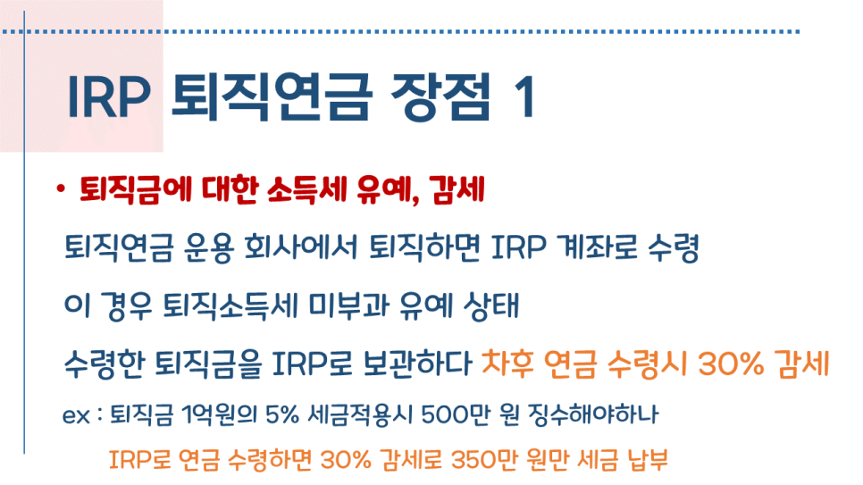 이제는 IRP의 장점이에요.우선, 퇴직금에 대한 소득세가 유예 되어 후일 연금 수령시에는 감세가 적용됩니다. IRP에서 퇴직금 1억을 넣으면 세금을 신고하지 않고 미부과 유예상태가 되요.