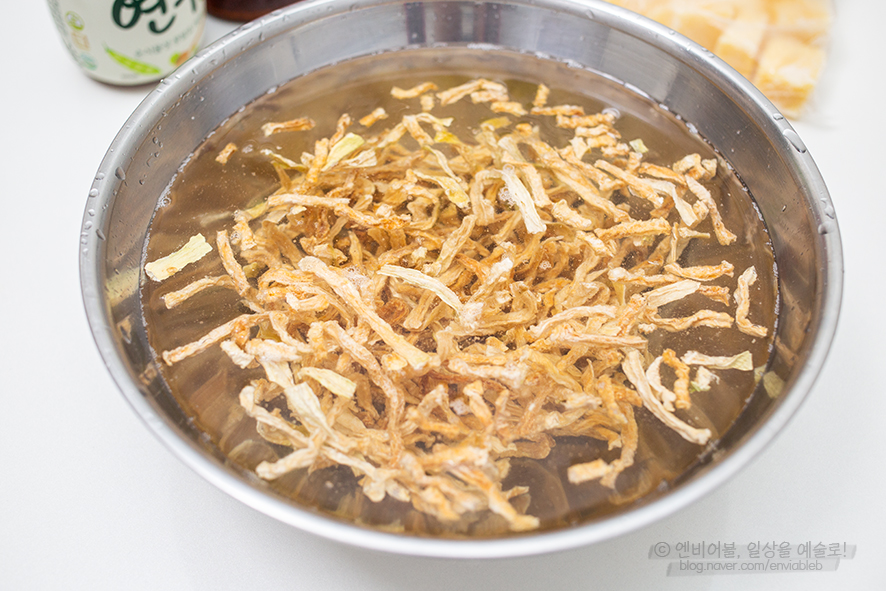 닭이 푹 익을 때까지 보쌈 무말랭이를 만들어 봅시다 말린 무말랭이 1팩(125g)을 찬물에 30분간 불려 주세요. 물에 불리면 냄새가 난다고 하니 찬물에 30분~40분 천천히 담그시면 좋습니다. 호명되는 시간은 원하는 식감에 따라 가감해 주세요.