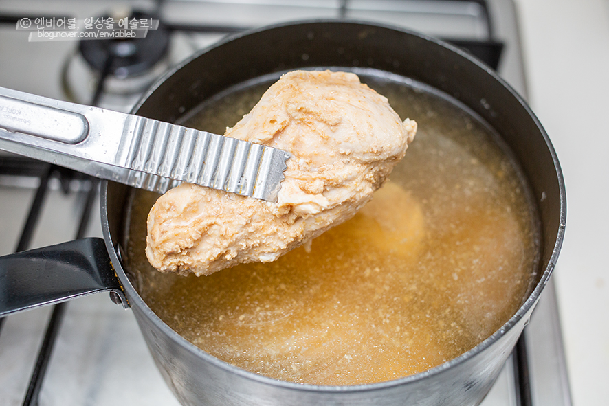 이렇게 비닐에 넣어서 공기를 차단해서 냉장실에서 10시간 넘게 재워줍니다저는 자기 전에 이렇게 냉장실에 넣어놓고 아침에 일어나서 삶아줘요. 냄비에 물을 1.5리터 이상 많이 넣고 팔팔 끓이세요불 끄고 바로 닭고기 넣기 반나절 넘게 된장에 담가놓은 닭가슴살이에요 된장을 발라서 그냥 물에 넣어요 팔팔 끓이기 > 불끄기 > 닭고기 담그기 > 불을 켜고 10초 가열 > 불을 끄고 뚜껑을 덮는다. 팔팔 끓던 물이 차가운 냉장닭고기가 들어가면서 일시적으로 온도가 식은 거예요" 가스레인지에 불을 붙이고 10초 정도 끓이면 물의 온도가 조금 올라가요. 바로 불을 끄고 뚜껑을 덮고 그대로 6시간 두면 됩니다.