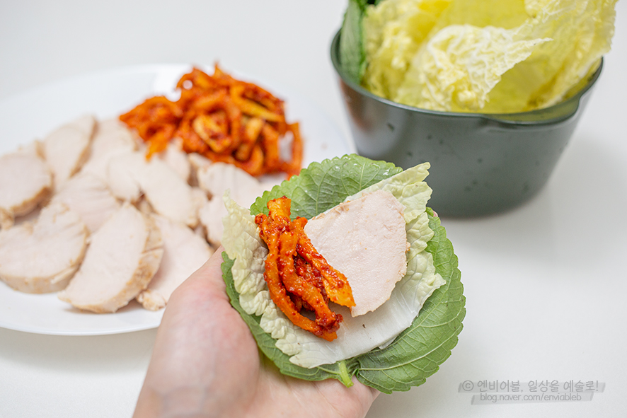 보쌈, 무말랭이 무생채 올려서 쌈으로 먹어도 최고 야채를 여러 장 겹쳐 먹으면 포만감 최강이네요. 샐러드에 드레싱을 뿌려먹는 것보다 훨씬 입에 맞아요.식단은 '평생 유지할 수 있을 정도로 하라'고 하잖아요. 원푸드, 절식, 단식은 절대 유지되지 않으니까. 하지만 이런 닭가슴살 보쌈 같은 메뉴라면 평생 세 끼 먹어도 먹을 수 있을 만큼 맛있는 한식입니다. 제가 만들어도 정말 잘했을 것 같은 레시피!