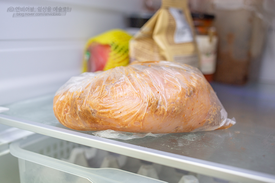 단면의 촉촉한 수분감이 보이시나요?고기를 집어먹기만 해도 입안에서 사르르 녹아 촉촉함과 쫄깃함까지 느낄 수 있는 식감입니다. 월계수 로즈마리 허브향은 왠지 잘 먹기에는 부담스럽고 질리는 맛이었는데- 된장향이 배어 있어서 정말 세끼 먹어도 질리지 않고 매일 먹어도 입에 맞는 한식 치킨이 되었습니다!