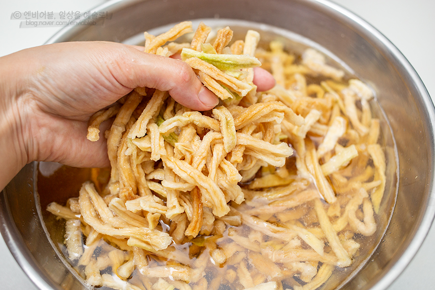 저는 30분 늘어난 식감을 좋아하거든요 이것보다 더 독한 걸 좋아하면 부르는 시간을 줄여주고 완전 통통하고 부드러운 걸 좋아하면 40분 더 불리면 되죠 이렇게 통통한 무말랭이는 물에 서너 번 씻습니다. 먼지나 거품이 많이 나오므로 세심하게 씻어 물기를 짠다.