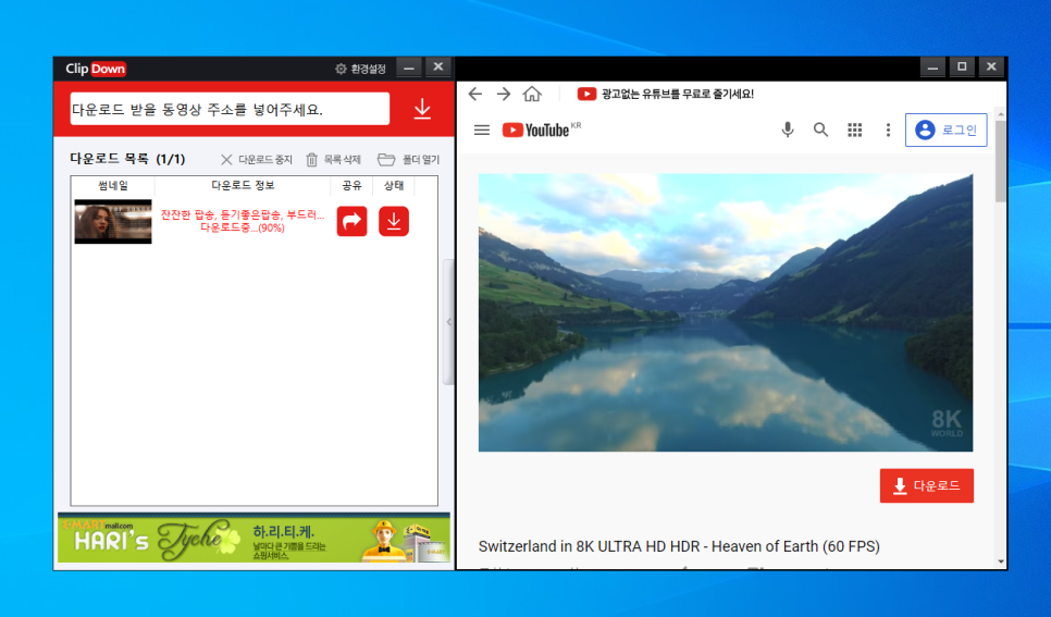 우선 기본창을 활용하는 방법부터 살펴보면, 유튜브 음원추출을 원하는 영상 위에 마우스를 올려놓으면 좌측 상단의 다운로드 버튼이 활성화되고 이를 클릭하면 첫 번에 한해 저작권 관련 팝업이 열리고 동의하는 경우에만 다음 단계로 넘어갑니다. 참고로 두 번째부터는 안 나와요 잠시 기다리시면 새로운 팝업창이 뜰 거예요 Audio만 Import할 것인지 Video만 Import할 것인지를 묻고 해상도도 설정할 수 있습니다. 해상도의 경우 원본 해상도를 따릅니다. 원본이 4K면 4K, 8K면 8K까지 받을 수 있는 거예요. 홈페이지에는 4K지원이라고 표기되어 있습니다만, 4320p(8K)까지 해상도 옵션으로 표시되는 것을 확인할 수 있었습니다. 원하는 옵션을 선택하여 저장하면 왼쪽 창에서 진행상태를 볼 수 있으며, SNS 소스 링크를 카카오톡, 카카오스토리, 페이스북, 네이버, 네이버밴드, 트위터 등을 통해 공유할 수도 있습니다. 저작권에 대해서 얘기를 하면서 공유하면 안 된다고 했는데 이게 무슨 기능인가 하는 분들도 계실 거예요. 파일이 아니라 링크를 통해서만 공유하고 있기 때문에 자유롭게 써도 좋습니다. 그리고 영상을 보다가 저장하고 싶은 것이 있으면 언제든지 다운받을 수 있는 다운로드 버튼이 있기 때문에 이걸 누르면 조금 전 리스트에서 누른 것처럼 진행이 됩니다. 여기 왼쪽 상단의 주소 입력란에 URL을 복사&붙여넣는 방법으로도 가능해요. 또한한번에하나가아닌여러개를동시에받을수있어서매우편리하고소중한시간도절약할수있습니다. 지금까지 알려드린 것도 쉽고 간단한 방법이지만 평소와 같이 Youtube에 접속하셔서 자유롭게 이것 저것 감상하시고 저장하고 싶은 콘텐츠가 보이시면 주소창 주소를 클릭하시고 Ctrl+C 또는 마우스 우클릭 후 복사를 하시면 오른쪽 하단의 팝업창이 뜨고 쉽게 다운받으실 수 있습니다. 만약 팝업창이 뜨는 것이 불편하면 환경설정에서 팝업 -> 미사용으로 변경하면 다음부터는 나타나지 않습니다. 그러니까 언제든 쉽고 빠르게 받고 싶으신 분이라면 사용하고 세팅하고 매번 표시되는 것이 불편하시면 사용하지 마시고 사용하면 되죠? 하지만 사실 유튜브 프리미엄 이용자가 아니라면 웹브라우저를 통해서 접속하는 것보다 클립다운에 있는 자체 브라우저를 사용하는 것이 훨씬 좋습니다. 왜냐하면 광고 없이 쾌적한 환경에서 시청할 수 있거든요 물론이방법이아니더라도다양한수단으로광고를제거할수는있지만두개의확장프로그램을설치해서사용하는것보다하나로통합해서사용하면가볍고관리가쉽습니다. 내친김에 제 채널에 올린 것 중 원본을 소실한 자료를 받는 과정을 동영상으로 제작해 보았습니다. 정상적으로 받을 수 없는 상황까지 폭넓게 나오니, 이것에 대해 알고 싶으신 분들은 참고하면 좋겠네요.