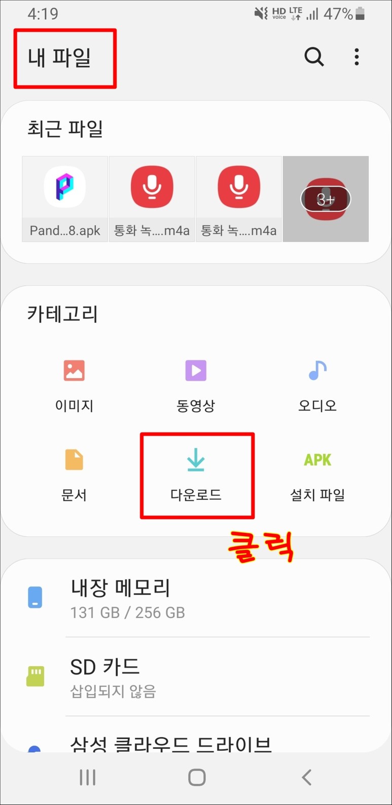 스마트폰 e 바탕화면에 가면 My File이라는 폴더가 있습니다. 해당 폴더를 열고 다운로드를 다시 누른 다음 응용 프로그램을 설치하고 열기 버튼을 누릅니다.