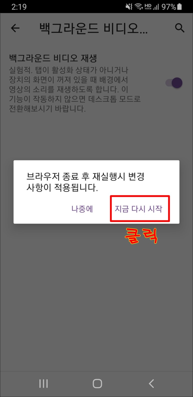 이번에는 좋아하는 음악이나 좋아하는 강의를 듣고 싶을 때 다른 화면으로 가더라도 영상 소리를 재생하는 '바씨크라운드 플레이' 기능을 설정해 보자.