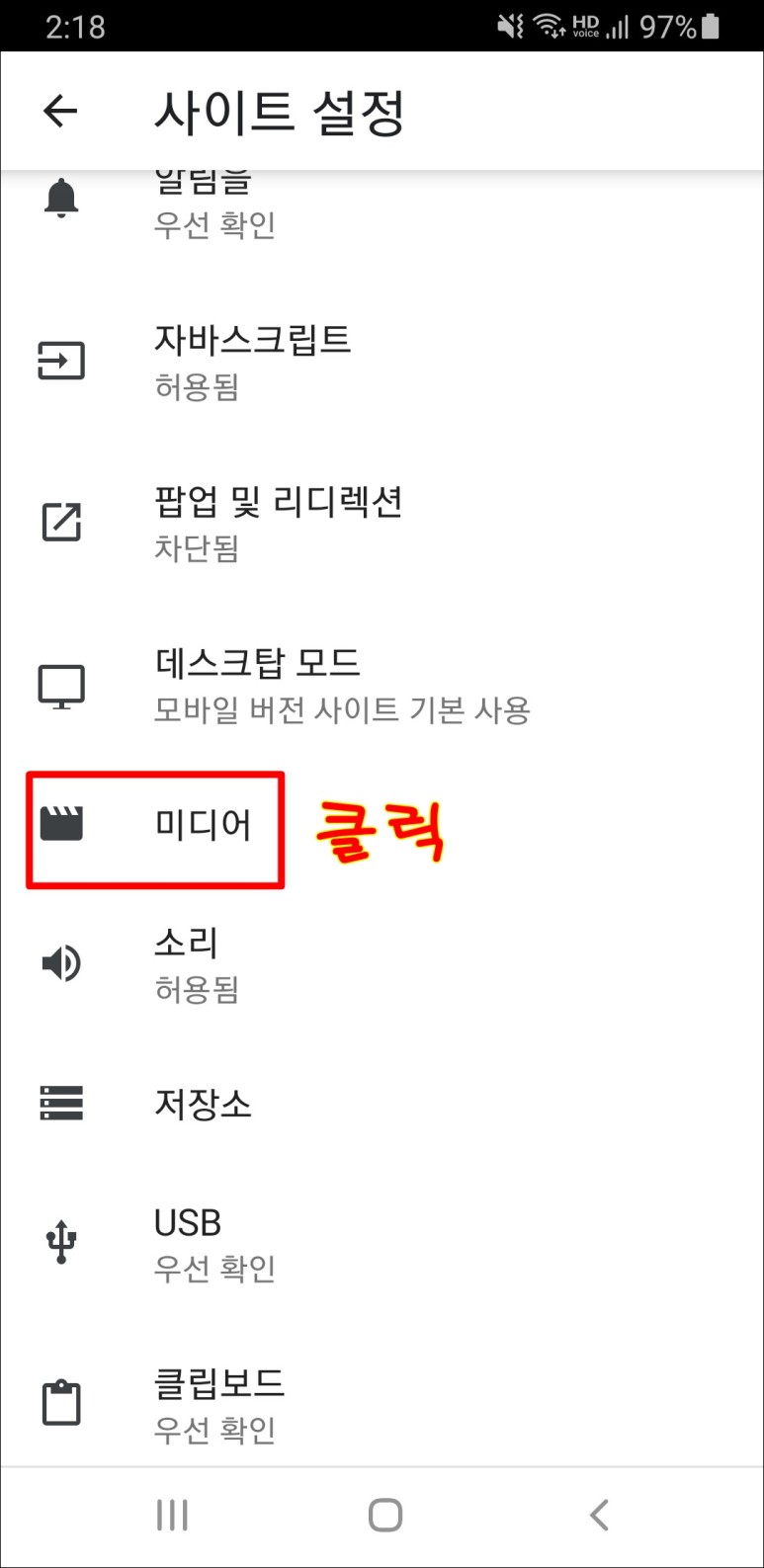 설정 내에 있는 사이트 설정 및 "미디어"를 찾아 누르십시오.