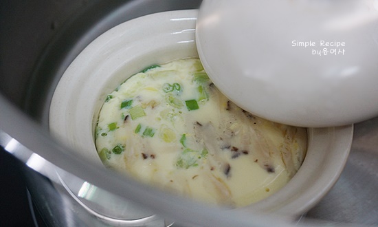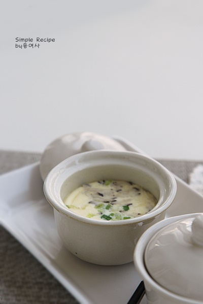 1인분 도자기 그릇에 달걀 물을 8.0% 정도 붓고 쪽파와 표고버섯을 위에 담아 뚜껑을 닫았습니다.tip) 적당한 도자기 그릇이 없으면 머그컵을 이용하면 굿!!! 뚜껑이 꼭 있어야해!! 뚜껑이 없으면 호일을 냄비속 물에 닿지 않게 덮어주면 되요!!