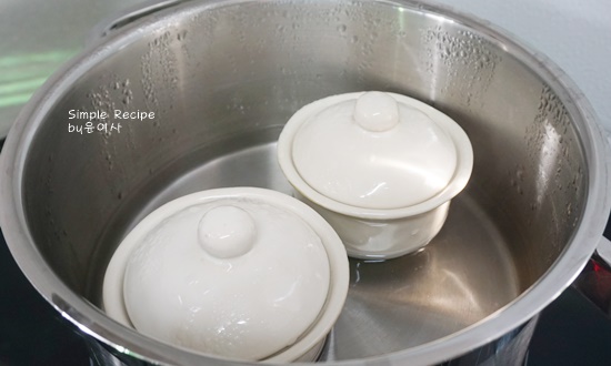 넉넉한 냄비에 도기접시의 절반 정도가 올 정도로 물을 붓고 끓인 후 도기그릇을 넣고 냄비뚜껑을 닫고 약한 불에서 10분 정도 쪄주면 부드러운 계란찜 만드는 방법이 완성됩니다.tip)도자기의 종류에 따라 조금 시간이 달라질 수 있는데 익지 않았다면 뚜껑을 다시 덮고 조금 더 찌면 됩니다